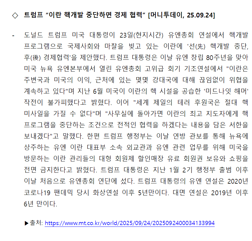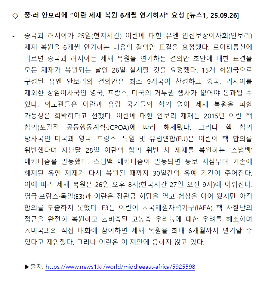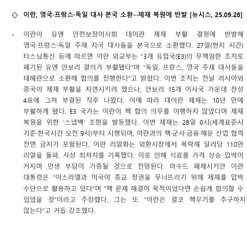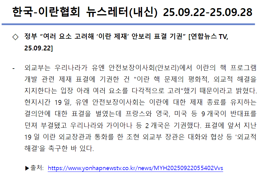 [내신] 한국-이란협회 뉴스레터 [25.09.22 ~ 25.09.28]