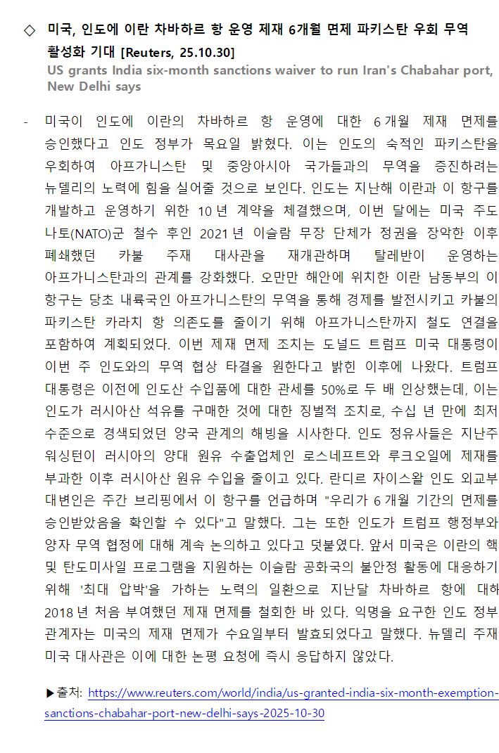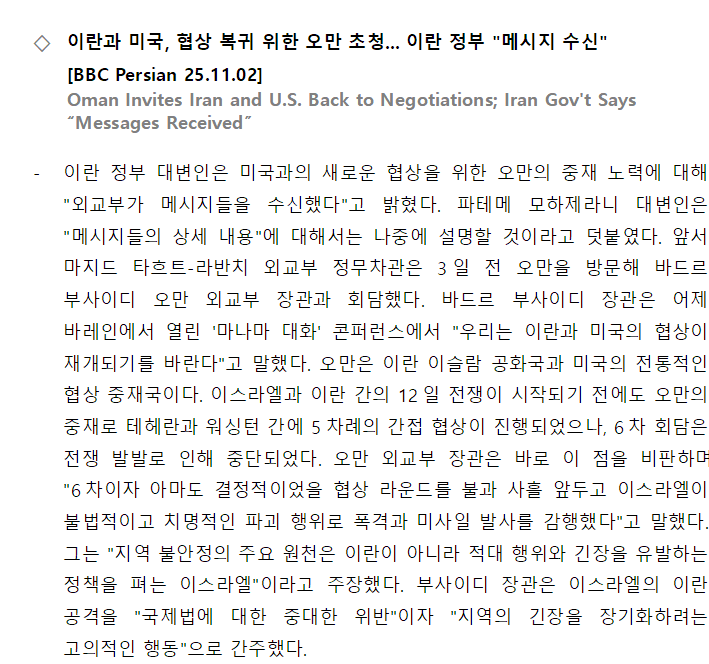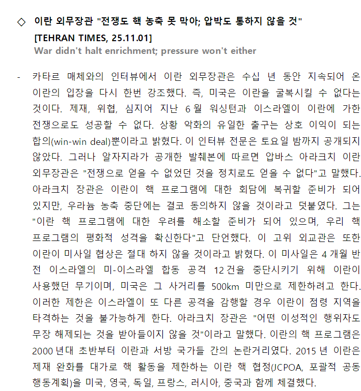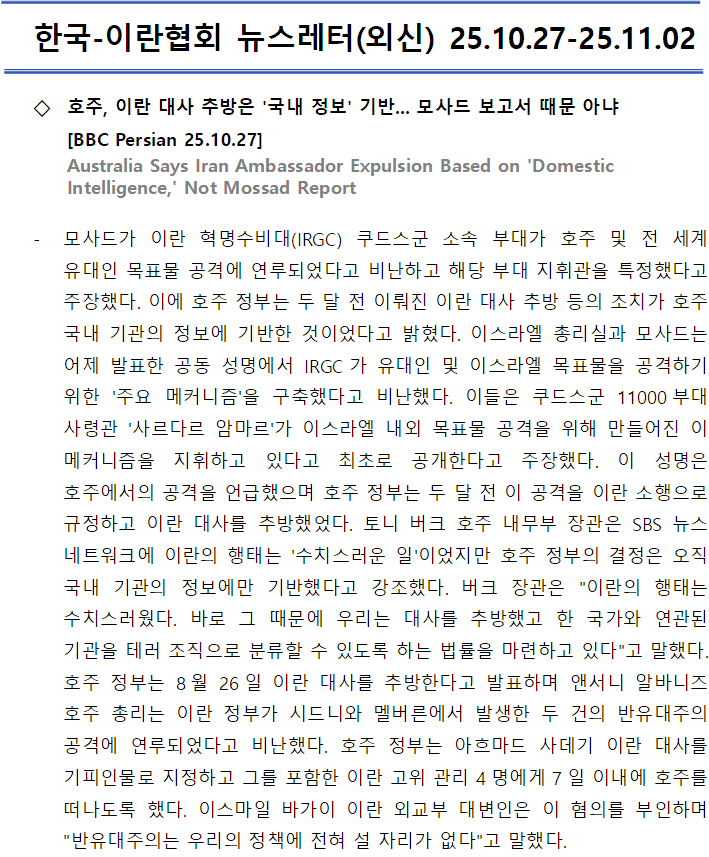 [외신] 한국-이란협회 뉴스레터 [25.10.27 ~ 25.11.02]