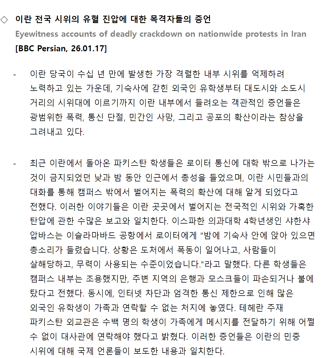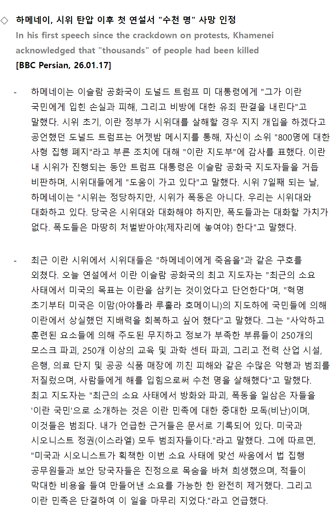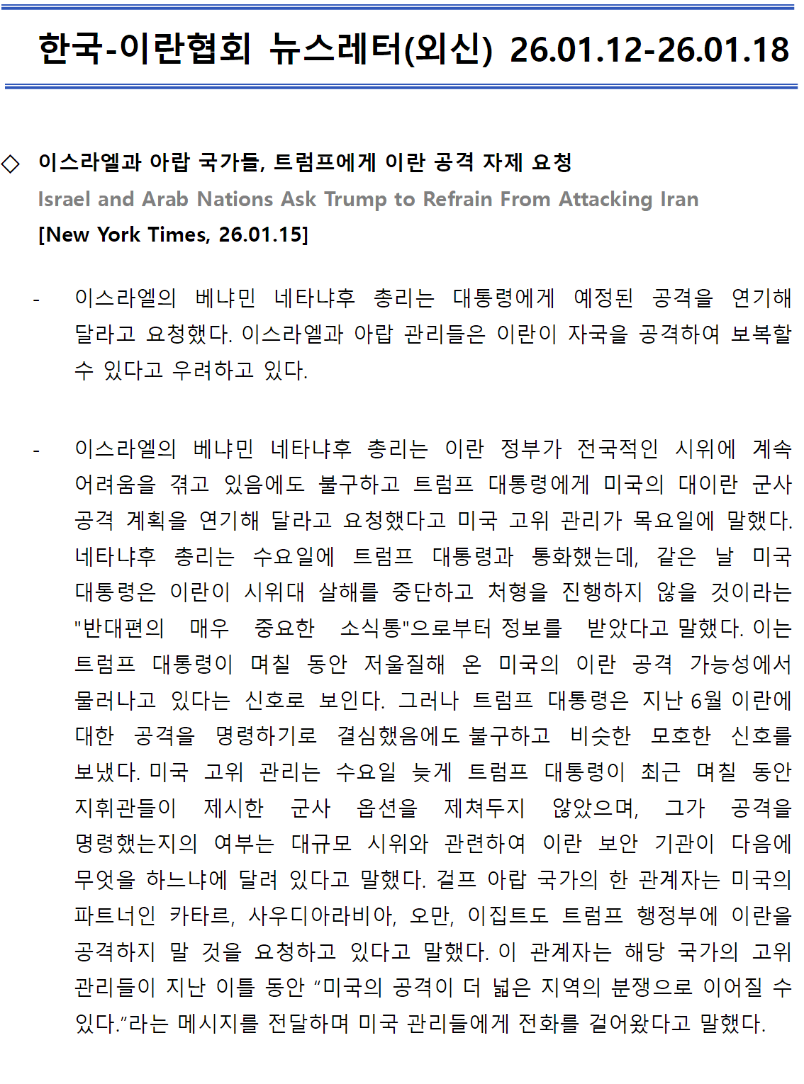 [외신] 한국-이란협회 뉴스레터 [26.01.12 ~ 26.01.18]