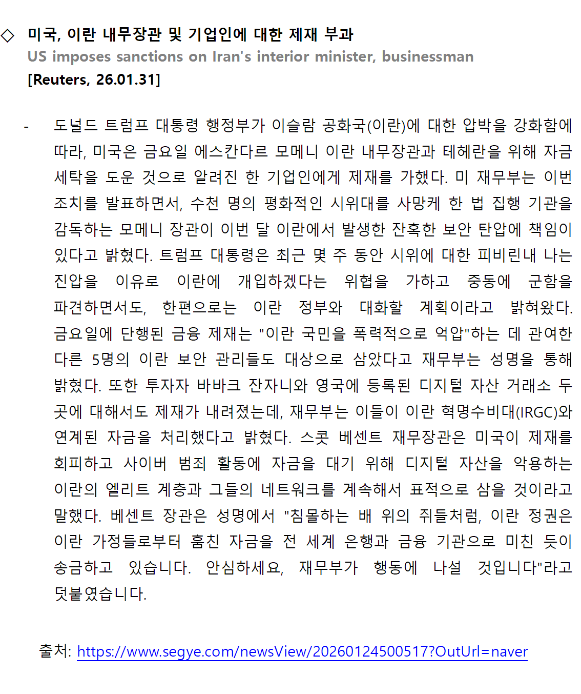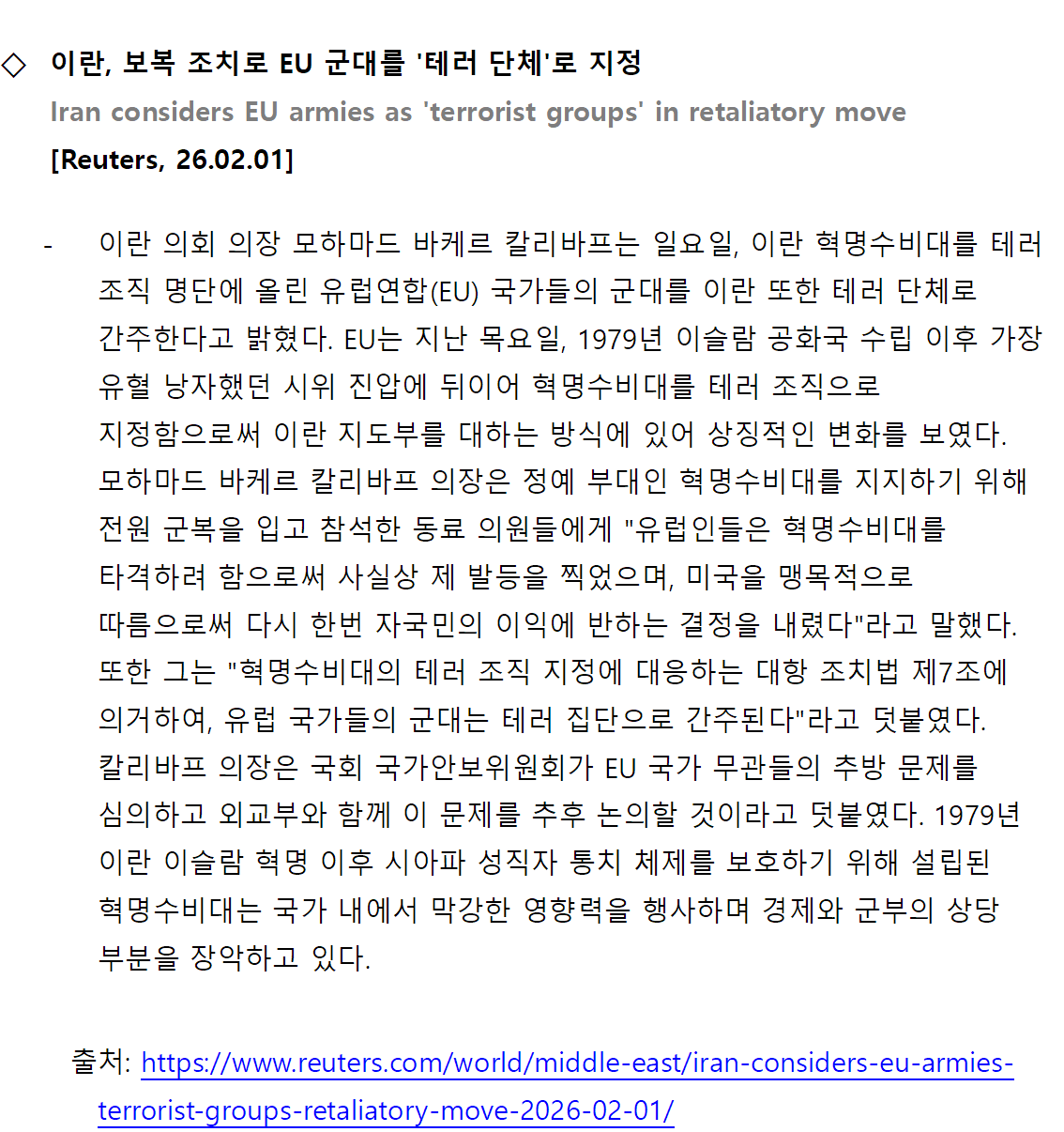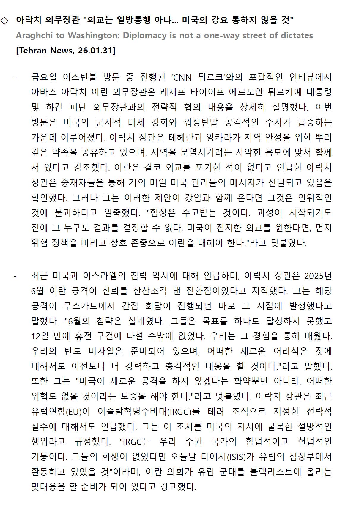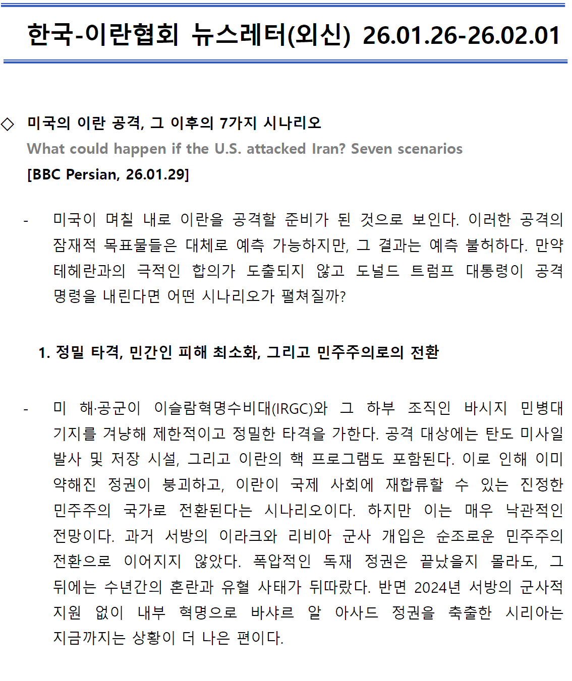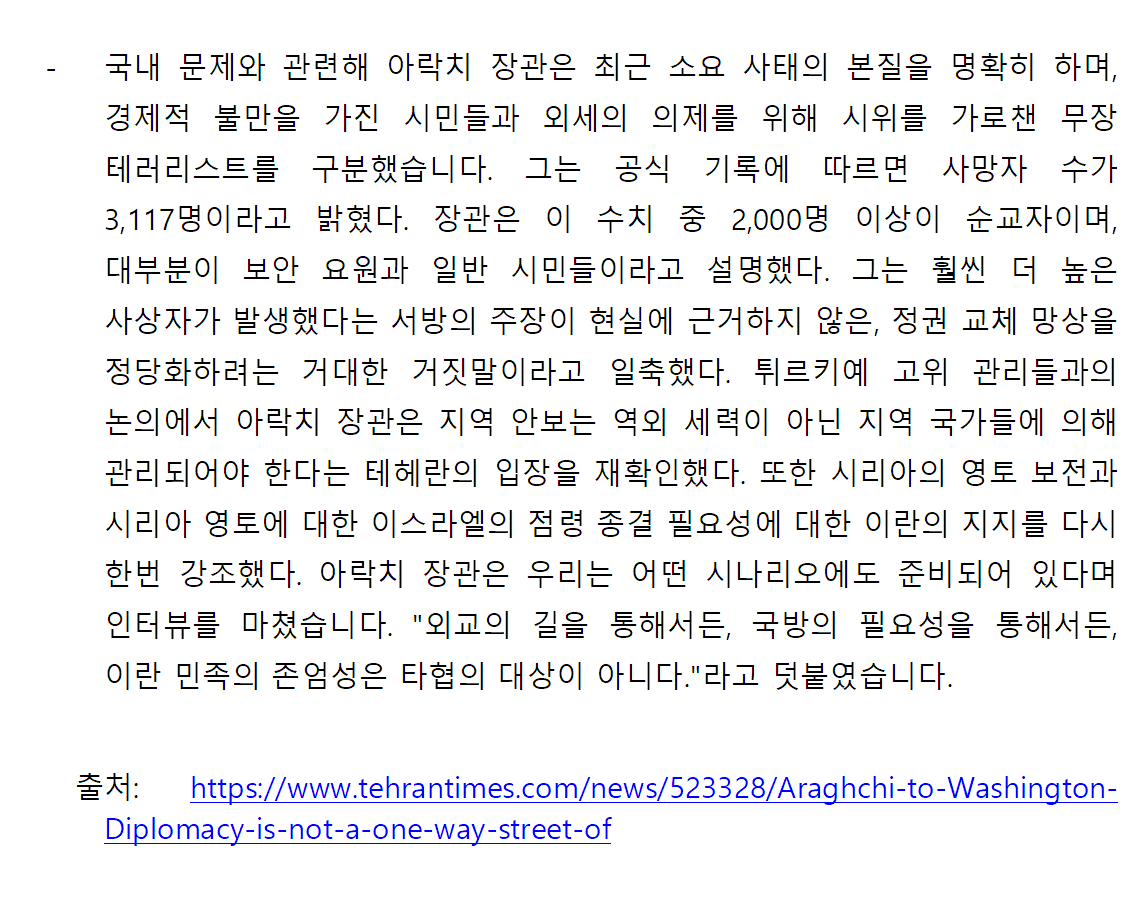 [외신] 한국-이란협회 뉴스레터 [26.01.26 ~ 26.02.01]